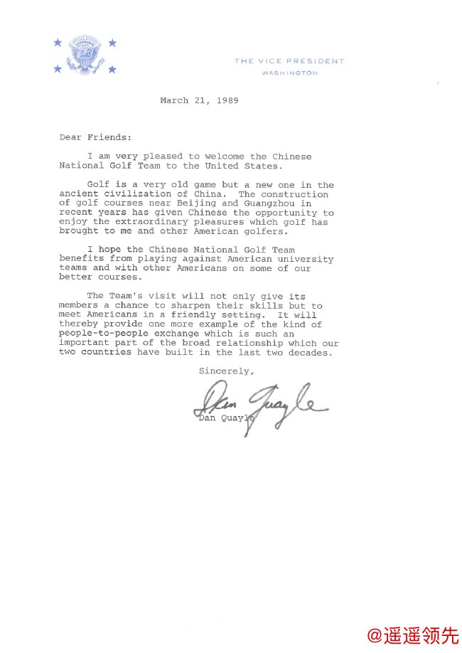 1989年3月21日,美国副总统Dan Quayle (丹奎尔) 给正在美国访问的中国高尔夫队写了这样一封信,信中表达的情感和信息,至少显示了中美高尔夫的交流有过一个梦幻般的开局。